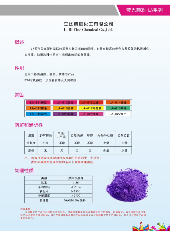 立比LA系列荧光粉是一种热固性树脂涂层,具有高的颜色强度和耐溶剂性强,立比LA系列适合C型凹印油墨,涂料,油漆,PVC有机溶胶,水性乳胶,天然橡胶和其他产品